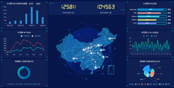 基于ECharts实现的大数据统计分析页面,蓝色科技感的程序员人数,技能,工程师年龄分布,地图公司人员流动图,各地区程序员占比大数据统计页面模板。