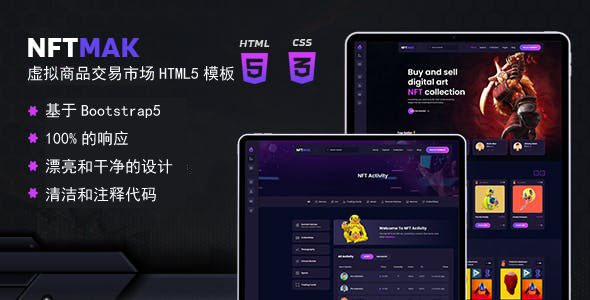 NFTMAK是一个NFT市场网站HTML5模板,独特和了不起的UI设计,美丽的主页设计以及14个内部页面。它适合数码产品,数码市场,加密艺术品,构建任何你想构建的网站。