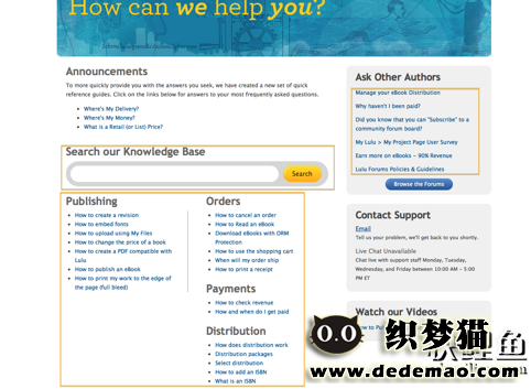 图中Lulu.com的FAQ页面很值得学习。它的搜索功能和组织分类的问题可以方便用户快速找到答案。